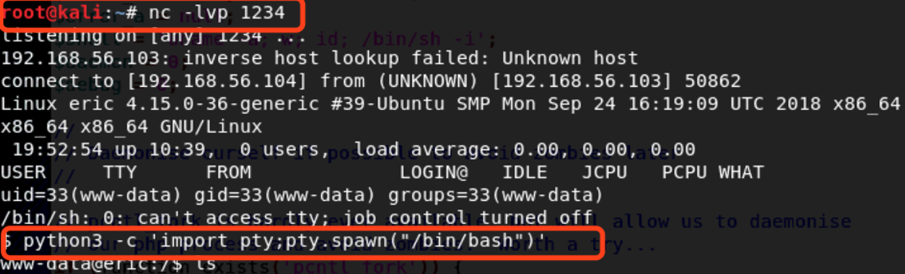 连接kali,反弹shell,kali的IP地址为192.168.56.104,监听端口为1234:nc -lvp 1234